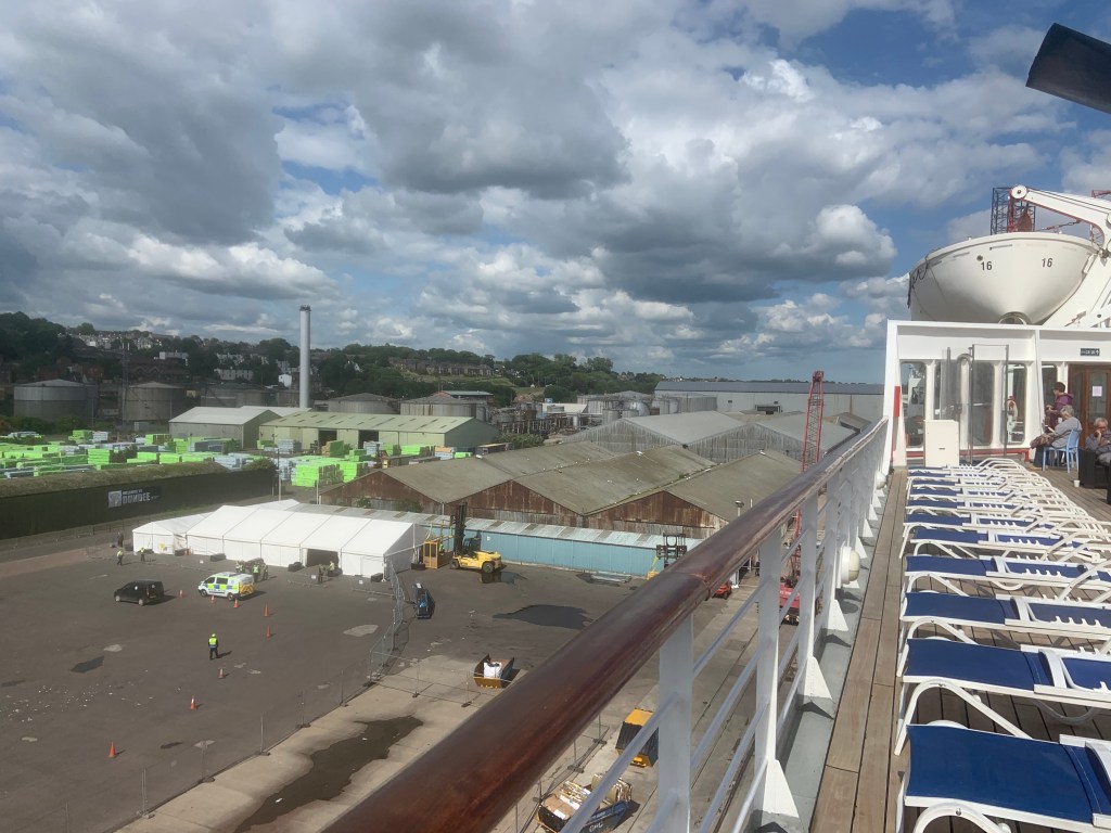 So my first day( yesterday) started at a leisurely pace with a taxi from home to Dundee docks, a 10 minute drive, great, compared to the usual overnight in Edinburgh followed by a full day traveling across to somewhere like Fort Lauderdale with another one or two nights there before embarking on a cruise. Huge saving in both time and cost, although I must admit the travel experience itself is generally rewarding. Arriving at the “cruise terminal” just before 16.00. Now when I say Cruise terminal, I should explain that as far as Dundee is concerned it is several marquees strung together resembling a refugee processing station. I could not help but cast my mind back to when I was a director in the Dundee and Angus Tourist Board and made the case that Dundee could be a prominent cruise terminal with its natural deep water port and advantages position on the East coast, advocating a purpose built terminal. Well here we are some twenty-five years later and we have aspired to a tent to welcome visitors to Dundee, a situation that is put to shame by the small Banana Republics of the Caribbean.