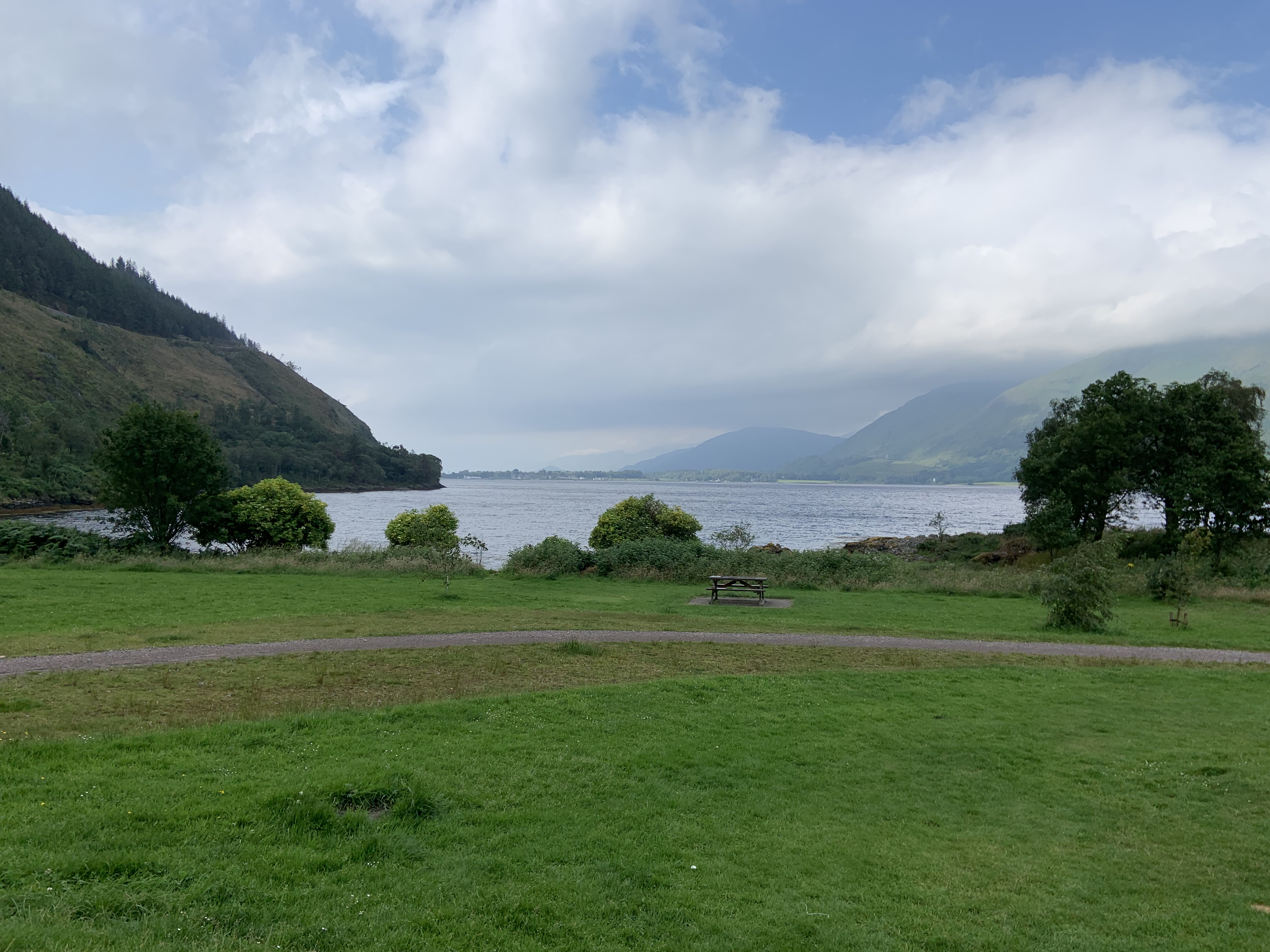 After the blistering hot day yesterday I woke up to the pitter patter of raindrops on my window and it went from there to a deluge. Oh well ,it is Scotland. So down for breakfast and then on my way again, heading South this time and retracing some of my trip yesterday as far as Newtonmore before turning West towards Fort William . A long drive ahead ,but I was intending stopping off at various points as I progressed towards my destination for the day which was Oban. The rain was coming and going with some quite bright and warm spells as I made my way along the banks of Loch Lagan. Looking towards the far bank I passed the estate that Queen Victoria considered as her home in Scotland before deciding on Balmoral