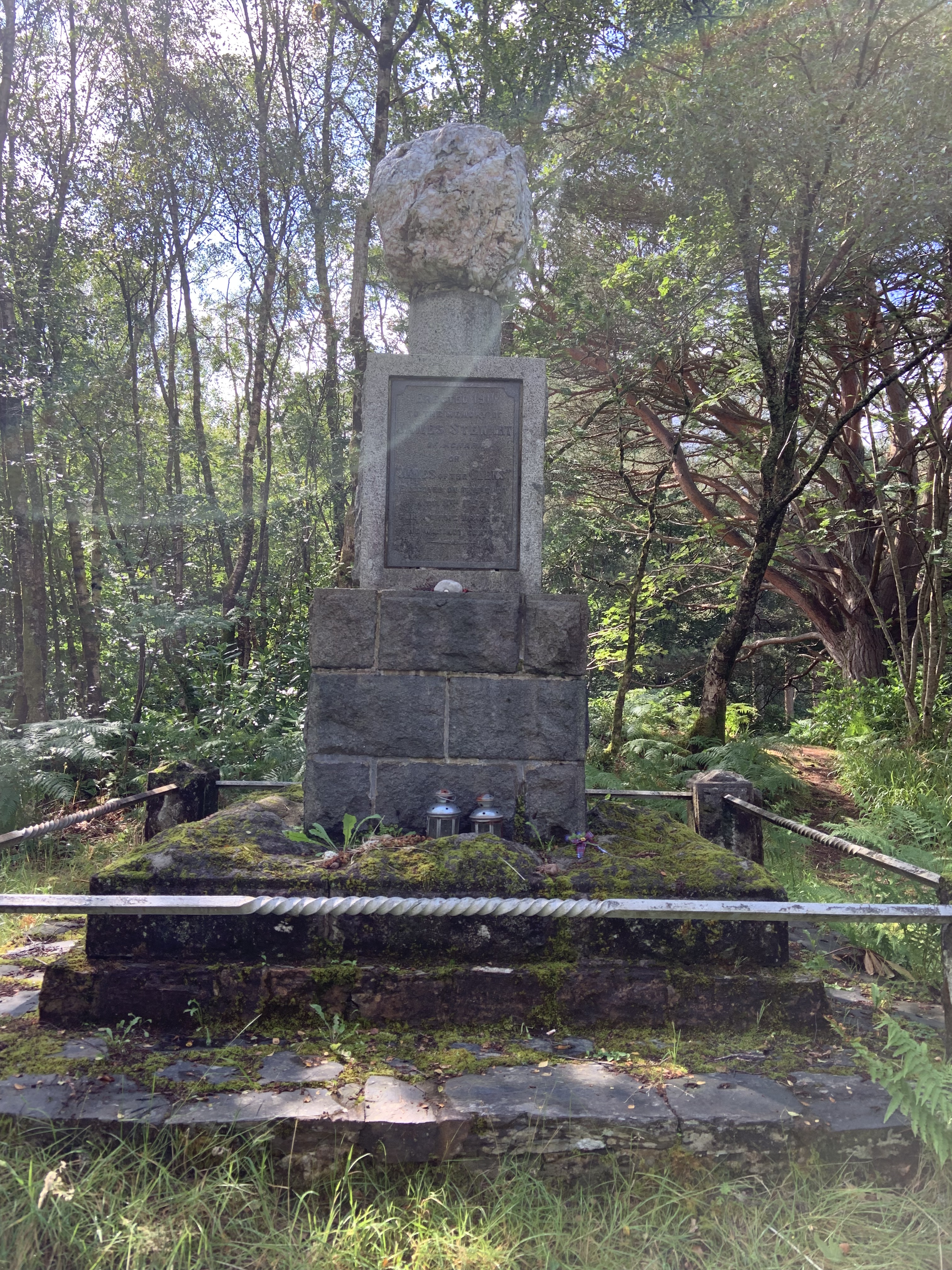 I don’t know if any of you have read the Robert Lewis Stevenson book Kidnaped, but if you have then this book described what was called the Appin murder. There is a character in the book called Allan Breck Stewart who was a kinsman of James Stewart ( James of the glen). You will remember that David Balfour and Allan became friends and had many adventures whilst traveling through this area of Scotland . Now the man who was killed was Collin Campbell a tax and rent collector for the Campbell ,Duke of Argyle and not a well liked person . One day whilst traveling through Appin he was shot and killed and James Stewart was blamed for his murder. Stevenson alludes to this incident in the book and more or less implies that it was in fact Allan Breck Stewart who did the killing . Now although this book was fiction ,it was based on historical fact and Allan Breck Stewart was an emissary of Bonnie prince Charlie who , after the battle of Culloden had to flee to France along with many other Clan chiefs. It was Allan Breck Stewards job to come back from France and collect dues from the various Clans to keep their exiled Clan Chiefs in the manner they were accustomed to. James was tried in front of a Campbell Judge and a Campbell Jury , found guilty and hanged where the monument now stands and his body was left there for over a year with a guard posted as a warning to any of the Clan who had similar thoughts .