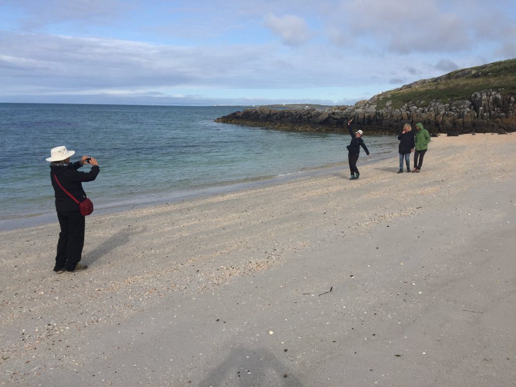 I digress, so after our visit to the closed, Politician and realising that a closed Politician Pub is about as useful as our real Politicians, I took the ladies a walk along the beach under strict condition that they were not to tear off their clothes and throw themselves into the sea as they did the other day on Lewis. They wandered off along the beach whilst I sat and pondered the meaning of life and the mysteries of the universe. Coming out of my trance I realised that they had disappeared from view around a headland and realising that we had to return to Askernish to collect the men and get to the ferry by one o’clock, I set off after them. When I reached the headland, they were nowhere to be seen. OOps lost four clients. How was I going to explain this to their husbands? My first thought was that they had indeed decided to go for a swim after all and been swept out to sea or been eaten by a sea monster. I headed back to the bus intending driving further along the road that ran parallel with the shore and there they were, waiting at the bus. Hmm , they had decided not to walk back along the beach to where I was waiting for them, in the full realisation that my mind reading abilities would kick in and I would of course deduce that they had taken another rout back, women!!