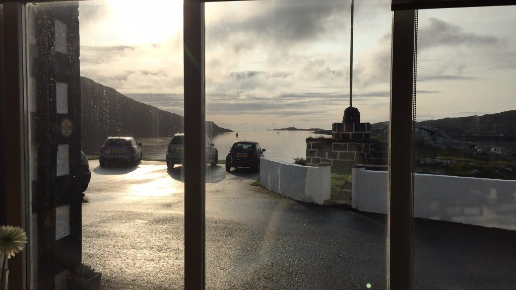 Last night after dinner ( which took far too long) I had my, now costomery, debate with the owner of the Lochboisdale hotel, on independence. These debates generally range into the night with copious amounts of beer and wine being consumed in the process and the rest of the bar customers becoming alarmed at times. Last night I had to be careful with the beer as I was driving today, but I am beginning to see chinks in his Unionist armour. His piece de resistance last night was.” Ah but you see I am actually for independence, but I would like to see a border drawn along the highland line, which would give the highlands and the islands, the oil” ” it wouldn’t work” I quickly retorted. “Why” he said ” because you would want to close the rigs on a sunday” I said. Game set and match. We always part the best of friends, agreeing to take up the debate on my next visit.