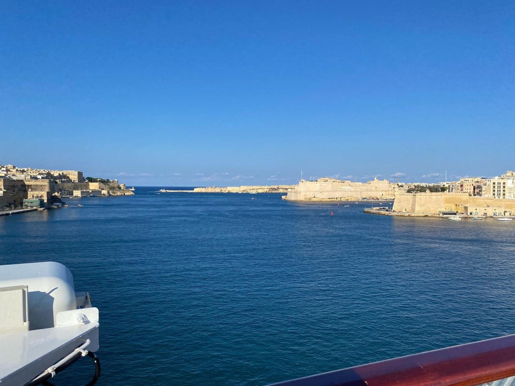 Sunday, and again a walk into Valletta to explore the harbor area and the narrow but in the main, straight streets of the town itself and a chance to indulge in what I have been missing the most ,during the pandemic, sitting at a street cafe, enjoying a capachino and watching the world go by, bliss. Then back to the ship for dinner which was exceptional.
