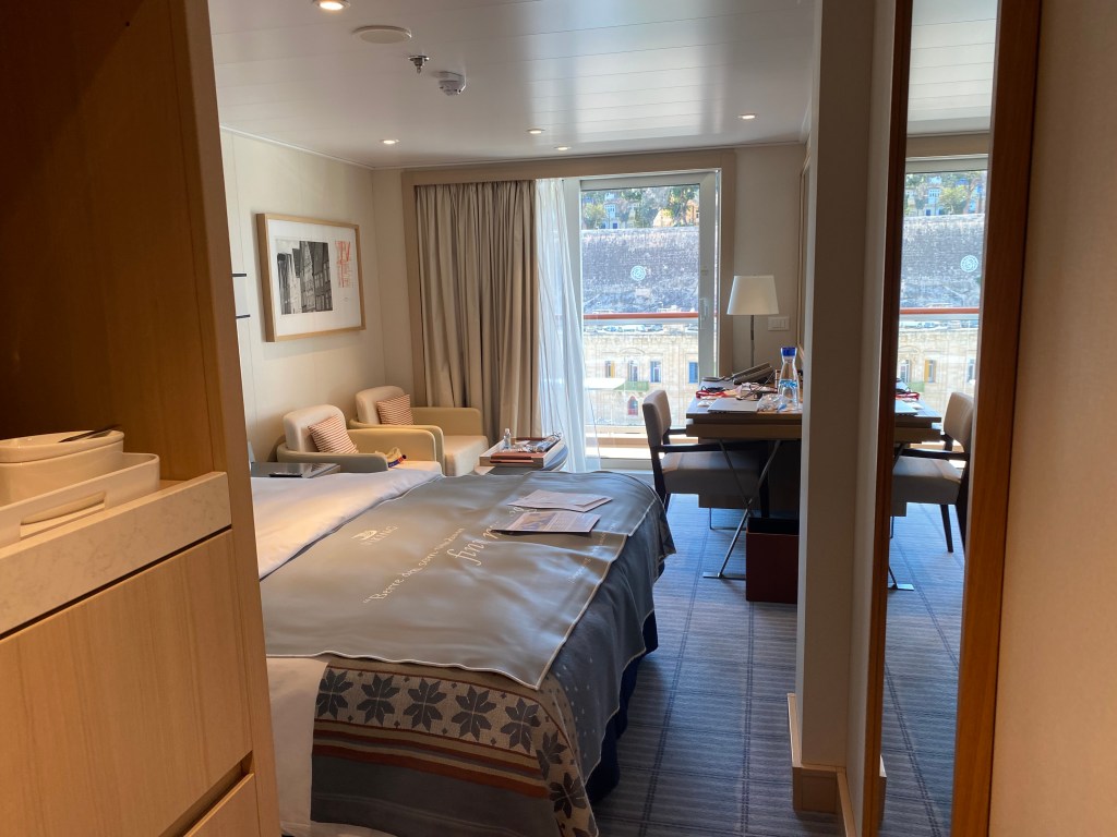 Now, at this point I should explain that Viking is not a cruise line I would normally choose and indeed this is the first time I have cruised with them, However Moira ( my travel agent) was able to obtain an exceptionably good rate for this cruise and an excellent veranda cabin for around about a third of the normal price for a single occupancy cabin.