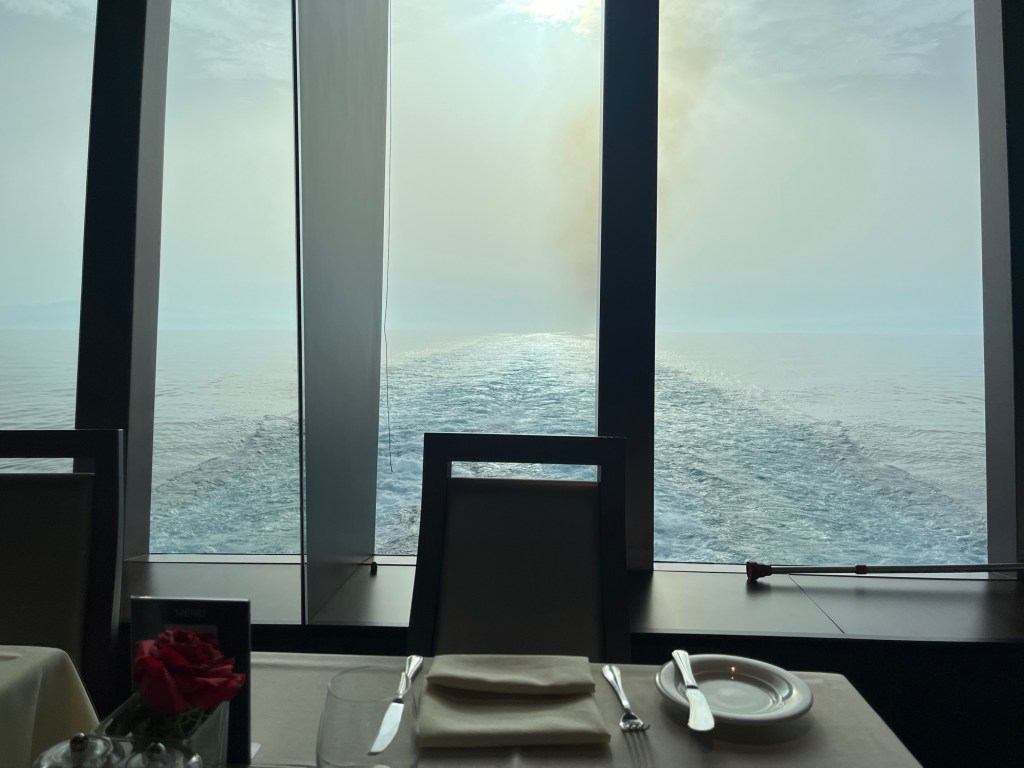 When I arrive I am escorted to my table by the restaurant manageress. The table is right at the stern of the ship with an uninterrupted sea view.