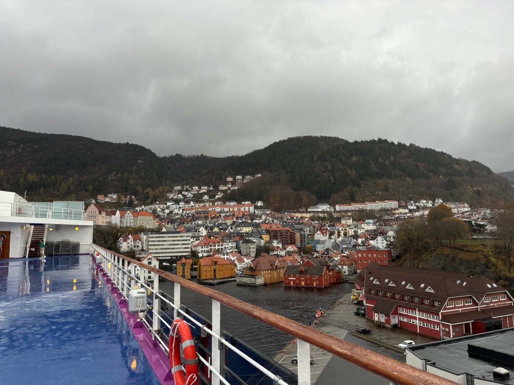 So after a pleasant, if wet day in Bergen I am back on the ship and again sitting with another Capuchino in one of the lounges, and contemplating the evening ahead, which will start with dinner in the Buckingham restaurant which is my allocated dining venue at late sitting. There is a lovely young Pilipino lady, Lian, who serves, and makes dinner very pleasant indeed. Food not too bad, indeed I have had a lot lower standards on some of the larger ships, and I cast my mind back to the last cruise I was on with MSC. It was that bad that I was making arrangements to leave after two days and only changed my mind after a meeting with three of the managers who offered quite an upgraded package altogether. So tomorrow we will be docking in Stavanger, followed by Kristiansand, then two days in Oslo and finally two days in Copenhagen in Denmark, before heading south to Newcastle and finally Dundee on the 8th November